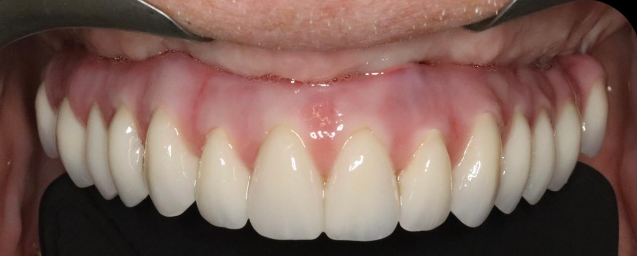 On the day of surgery, we carefully removed the failing upper teeth, placed multiple dental implants, and immediately provided a fixed provisional bridge. This “teeth-in-a-day” approach meant the patient left with a full set of stable, fixed teeth the same day, avoiding any period without teeth or the need for a removable denture.