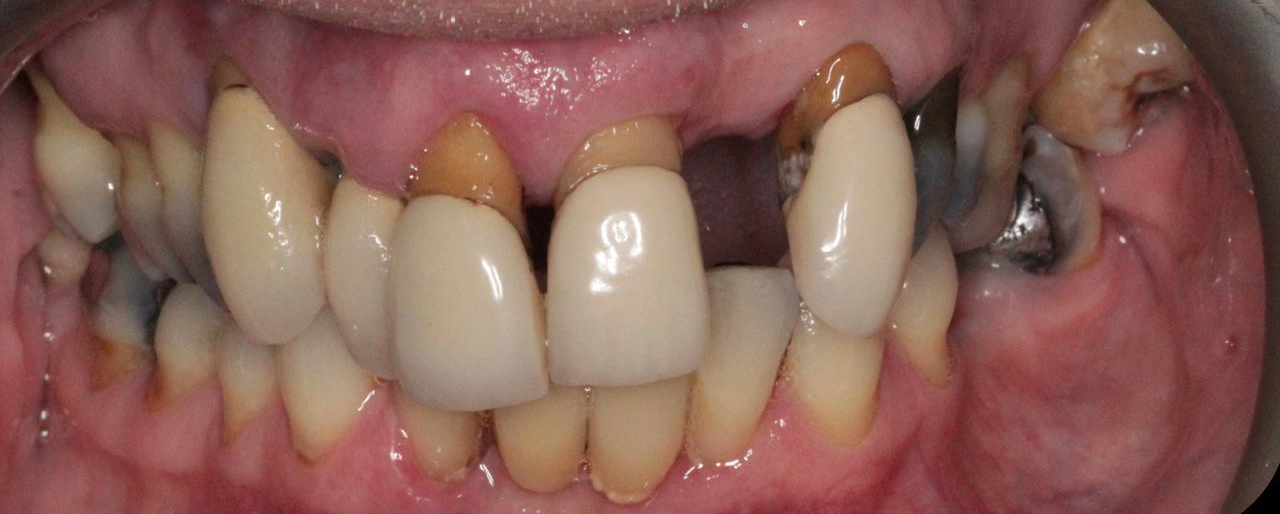 After a thorough clinical assessment and careful discussion of her concerns and treatment objectives, it became clear that many of the upper teeth had a very poor prognosis and could not be saved long-term. We discussed several treatment options, and the patient decided to proceed with dental implants and an immediate fixed bridge, as she wanted a permanent solution that would allow her to regain her confidence and function.